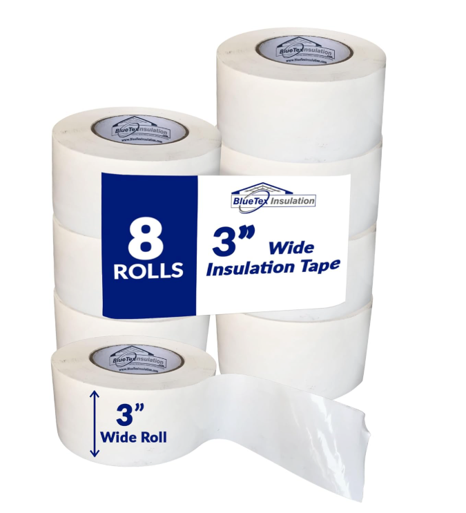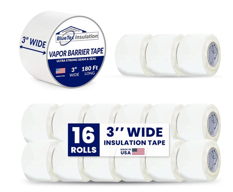 Size: Vapor barrier tape rolls are 3" wide by 180' long, available individually, in a bulk set of 8 rolls, or in a case of 16 rolls per box.